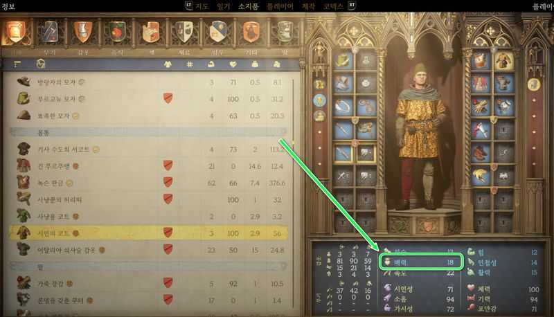 소지품 창으로 가면 현재 자신의 매력 수치를 확인할 수 있으므로, 매력 16이상이 되도록 맞춰줍니다.