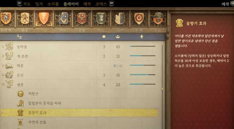 플레이어 → 기술 → 생존 탭에서 ‘꽃향기 효과‘ 퍽을 습득하는 것도 매력을 높일 수 있습니다.