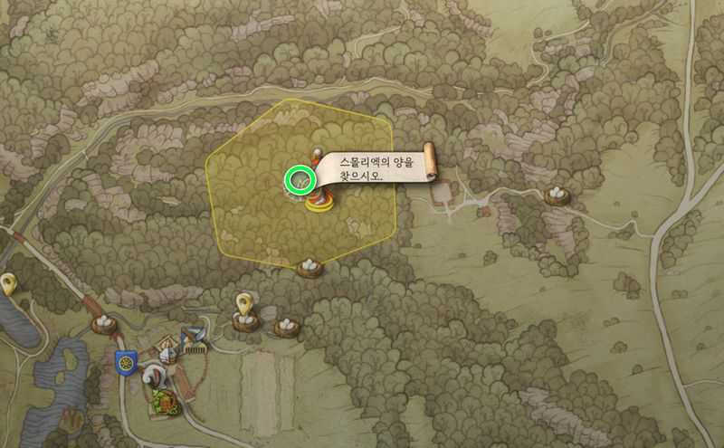 해당 위치로 가서 ‘양치기 스몰리크‘와 대화해 [지크프리트가 보내서 왔어.] → [도와줄게.]를 선택하면 과제 – 사라진 양이 발생합니다.