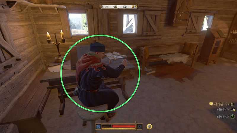 녹색 책 좌측에 있는 ‘서기관 가이블‘과 대화하여 아래 순서대로 선택합니다.