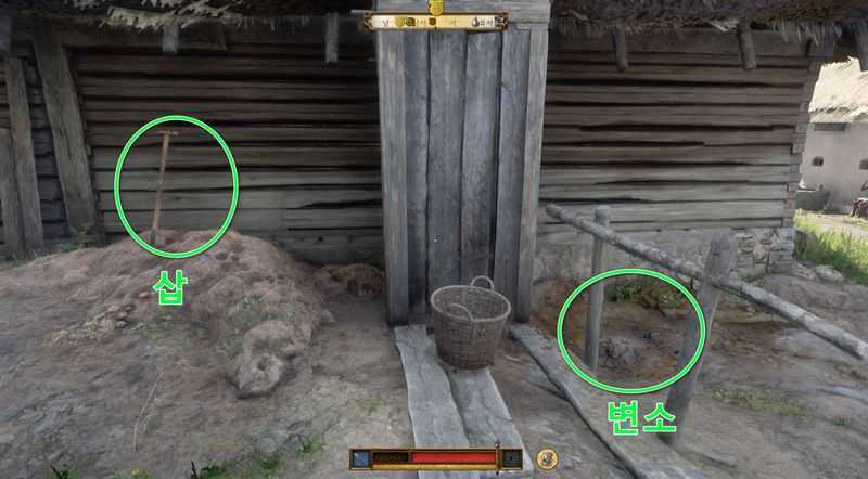 변소로 이동하여, 좌측에 있는 삽을 집어 들고, 우측에 있는 땅을 파서 변소를 치웁니다.