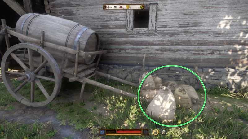 둥근 나무통이 실린 수레 뒤에 있는 자루 x8을 들고, 좌측 헛간으로 운반해, 짚이 쌓여 있는 곳 옆 귀퉁이에 놓습니다.