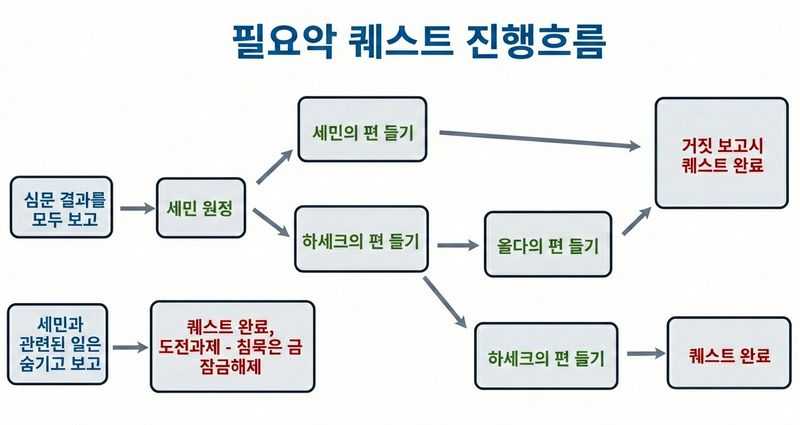만약 도전과제(트로피) – 침묵은 금을 잠금해제하고, 퀘스트를 쉽게 클리어하고 싶다면 아래 순서대로 선택합니다.