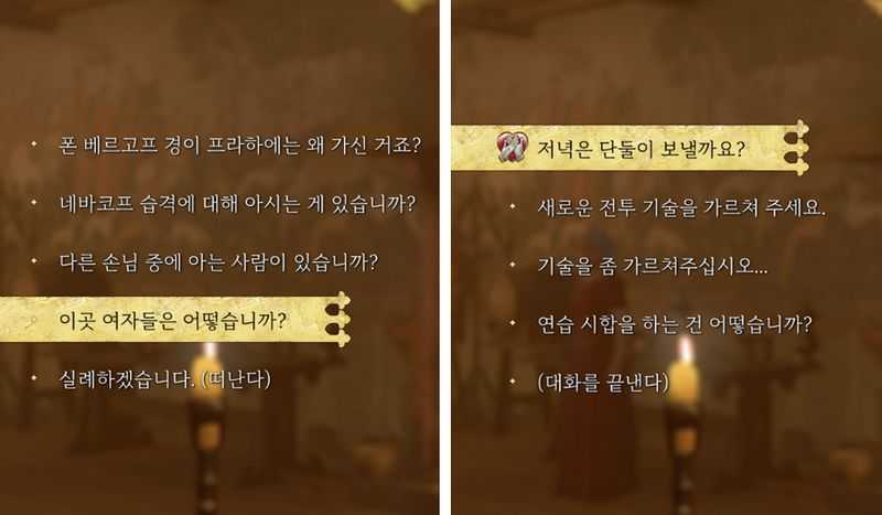검은 바르토쉬와 연애 이벤트를 보려면, 주요 임무 – 승리를 위해! 에서 연회 참석 전에 반드시 검은 바르토쉬와 먼저 대화를 하여, 명성을 올려두어야 합니다.