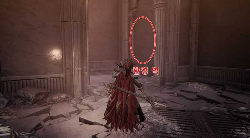 잠겨진 철창문에서 우측 길로 가면 계단이 보이는데, 계단을 오르기 전에 우측 벽이 환영 벽이므로, 파괴합니다.