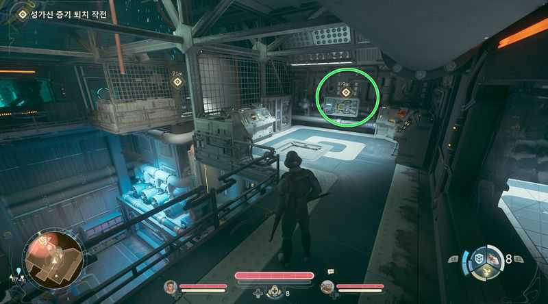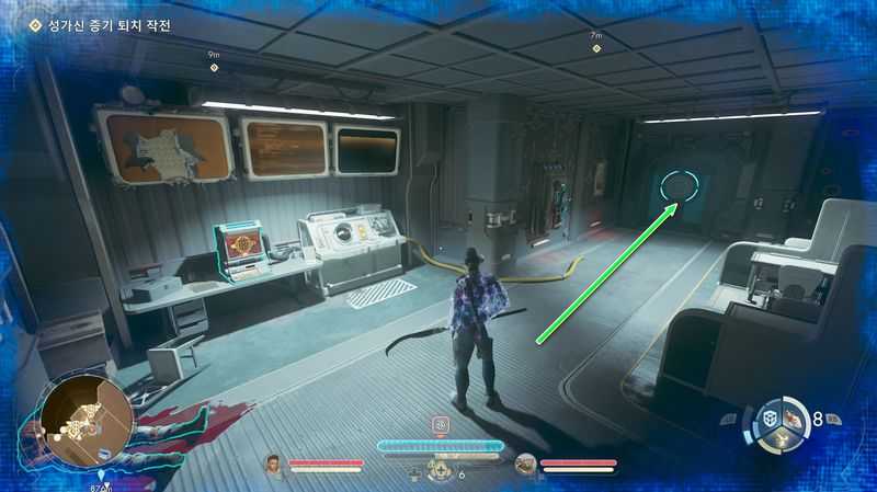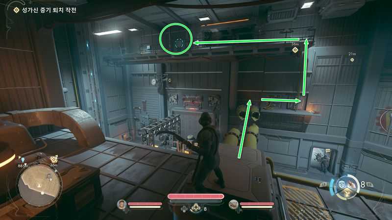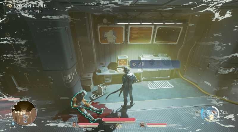 가스 누출을 수리하려면, ‘가스 에너지 전향 장치’를 활성화 한후, 정비 격납고로 들어갑니다.