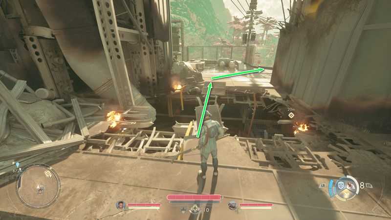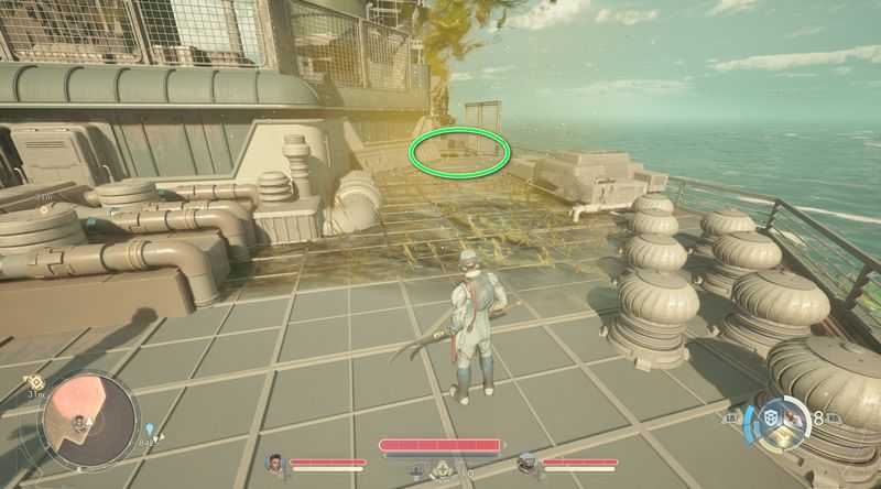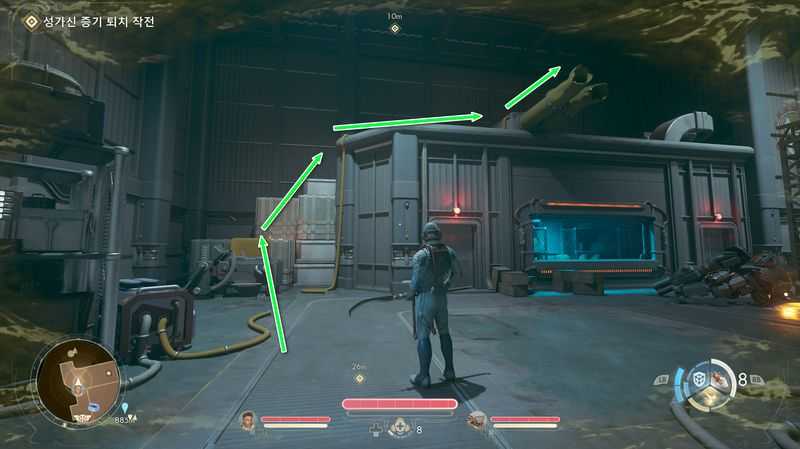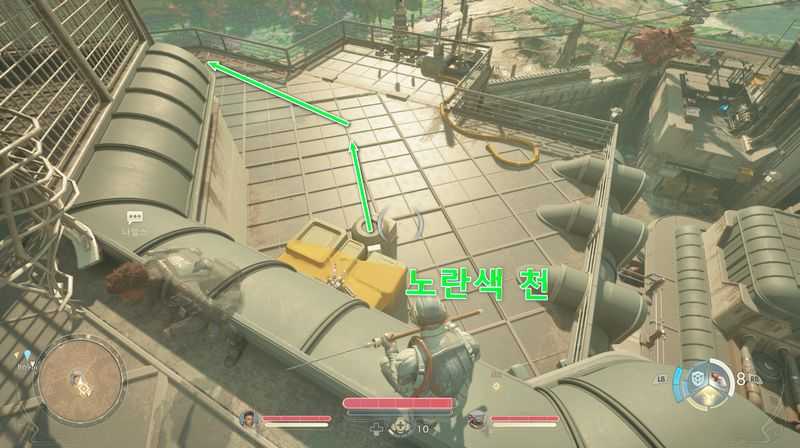 그후 맞은편 노란색 파이프로 점프하여 건너간 후, 사다리를 올라가, 위층의 문으로 들어갑니다.
