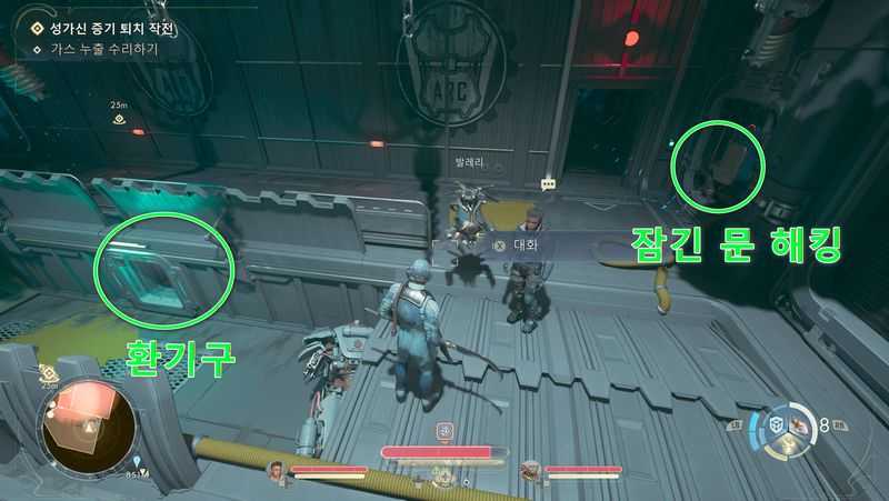 그후 잠긴 문을 해킹(해킹 2 필요)하거나, 중앙의 환기구를 통해 안쪽으로 진입합니다.