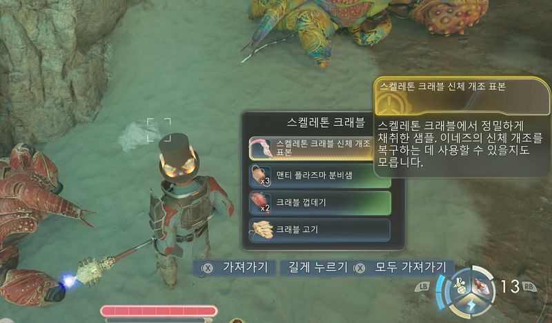 그후 보스 – 스캘레톤 크래블의 사체에서 ‘스켈레톤 크래블 신체 개조 표본‘을 획득합니다.