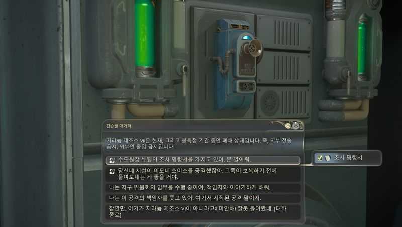지라늄 제조소 VII 안으로 들어가자마자 좌측의 사무실 안에 있는 ‘조정관 메타디에르‘와 대화하여, 조사 명령서를 제시합니다.