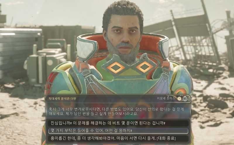 그러면 더반을 설득하기 위해, 비트 카트리지 x2500을 줄 수도 있고, 아니면 [몇 가지 부탁은 들어줄 수 있어. 어떤 걸 원하지?] 를 선택해 문제를 해결하는데 도움을 줄 수도 있습니다.