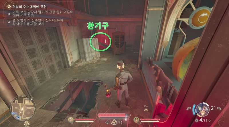 빨간색 화살표가 있는 문을 열고 들어가자마자 좌측으로 가면, 구석에 환기구가 보이므로 들어갑니다. 약간 앞쪽 바닥에 구멍이 뚫려 있으므로 빠지지 않게 주의합니다.