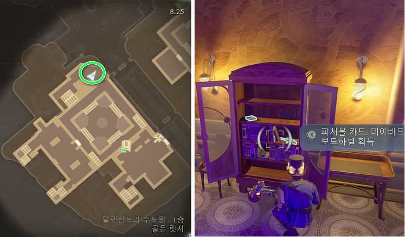 그후 방안의 책장을 열면 피치볼 카드: 데이비드 보드하넬 (독성 과다 한계치+1) 획득 (아마 해당 위치로 가면 지도상으로는 1층으로 표시될 것입니다)