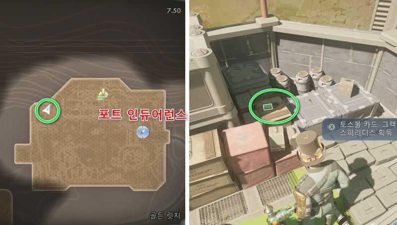 그러면 최종적으로 위 이미지에 표시된 포트 인듀어런스 북서쪽에 있는 건물 옥상에 도착하며, 그곳의 상자 위에서 토스볼 카드: 그렉 스피리디스(대미지 +1%) 획득