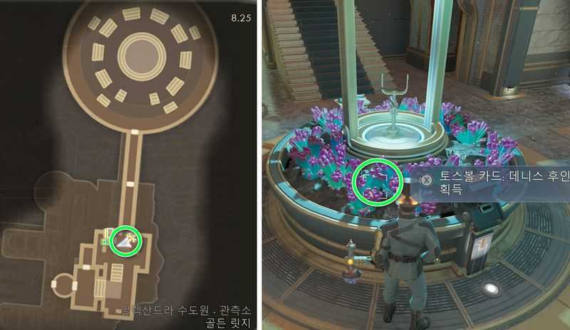 알렉산드라 수도원 관측소 남쪽에 있는 ‘작업대’ 근처에 ‘오라클 전시 케이스 접근 포디움‘이 있는데 그 앞의 보라색 크리스탈 위에서 토스볼 카드: 데니스 후인‘(치명타 확률+1%) 획득