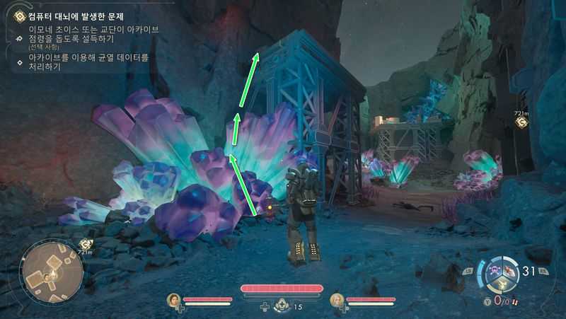 그후 벽쪽에 붙어서 보라색 크리스탈을 밟고 이단점프를 활용하면 위쪽 발판으로 올라갈 수 있습니다.