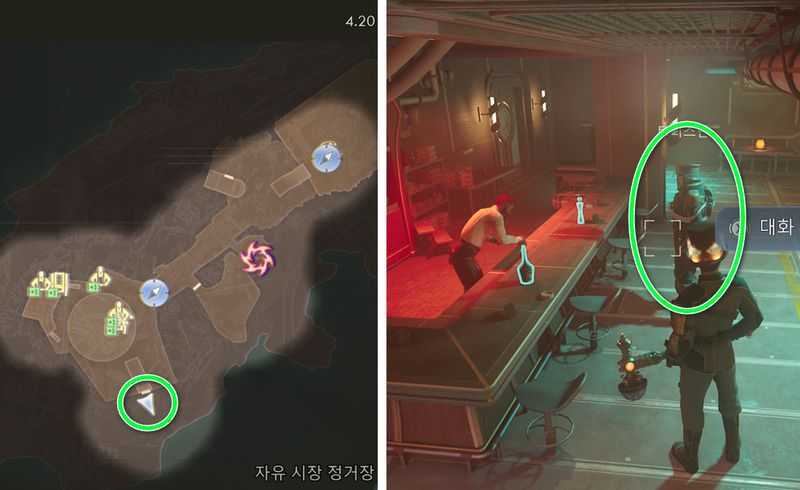 자유 시장 정거장 남서쪽 끝에 있는 세컨드 초이스(THE 2ND CHOICE) 바로 들어가, 카운터 앞에 서 있는 ‘트리스탄‘과 대화하면, 사이드 퀘스트 – 심판자적 수단이 발생합니다