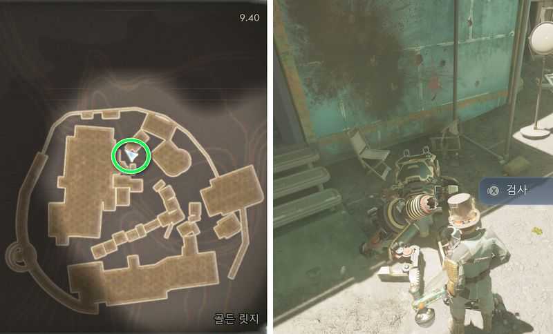 난민 캠프 북쪽으로 가면, 청록색 건물 입구 앞에 ‘심하게 손상된 자동기계‘가 있으므로 조사합니다.
