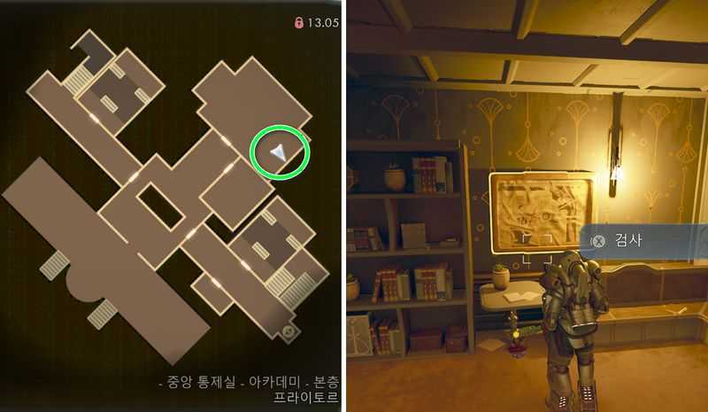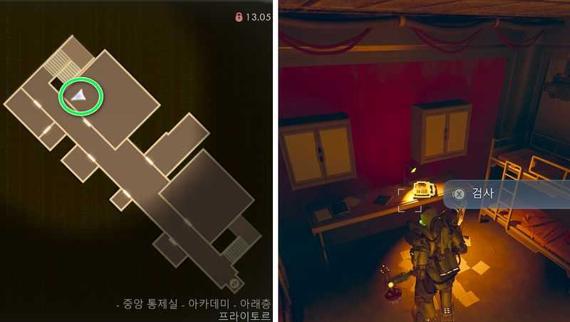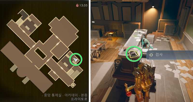 중앙 통제실 – 아카데미 – 본층에서 북서쪽에 있는 계단을 내려가 아래층으로 갑니다.