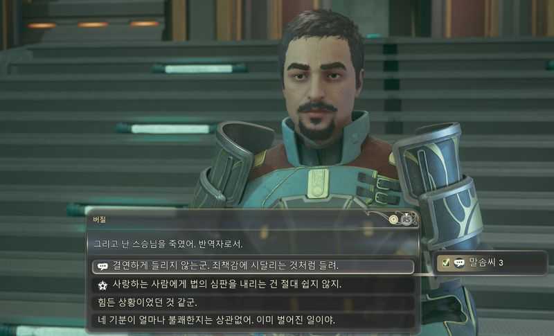 만약 ‘버질’을 죽이려는 경우, ‘트리스탄’의 파티 이탈을 막으려면, 대화중에 [이건 처형 사유가 될 것 같은데.]를 선택합니다.