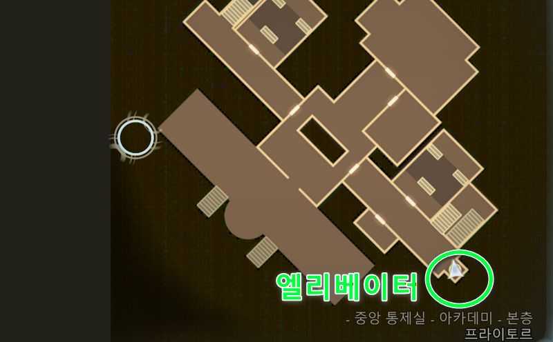 중앙 통제실 북동쪽에 있는 본관으로 들어가, 본관 남동쪽에 있는 엘리베이터를 타고 ‘상부 사무실‘로 이동합니다.