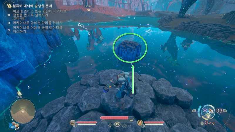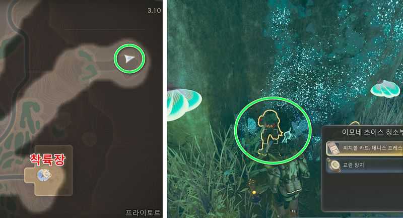 프라이토르 북서쪽 끝에 있는 ‘균열 이상’에서 남쪽에 있는 전류가 흐르는 호수로 가서, 위 이미지 위치의 바위 위로 올라갑니다.