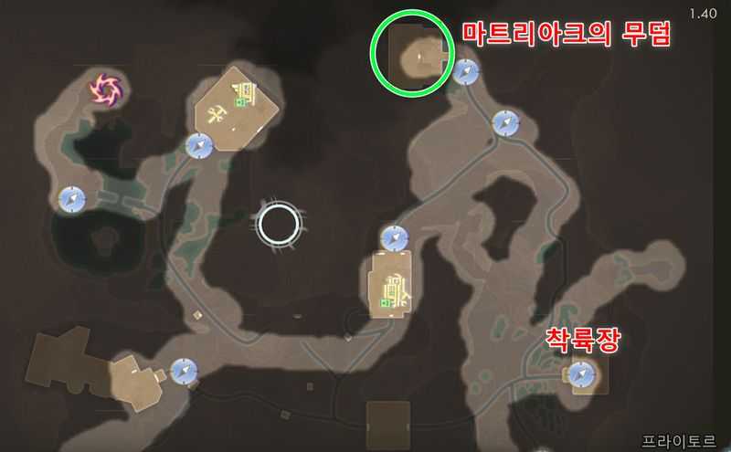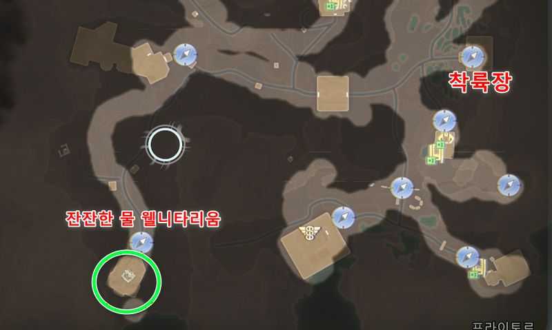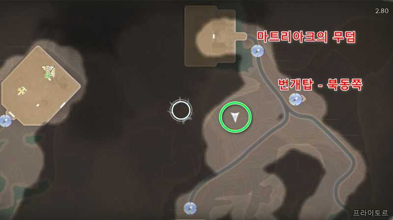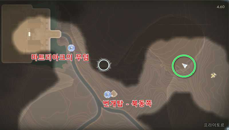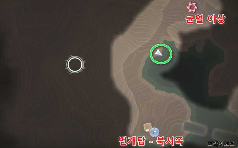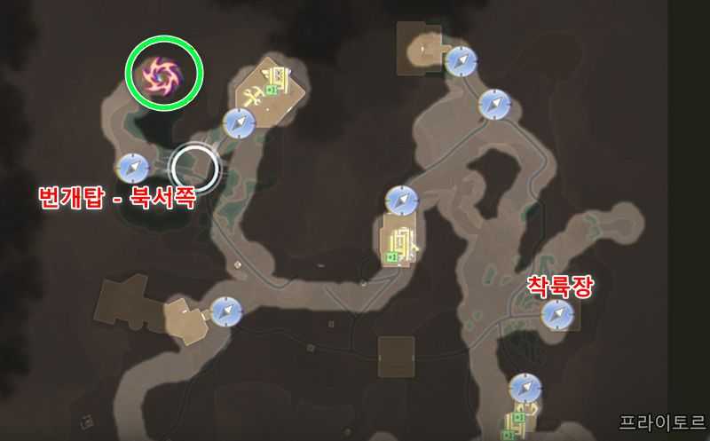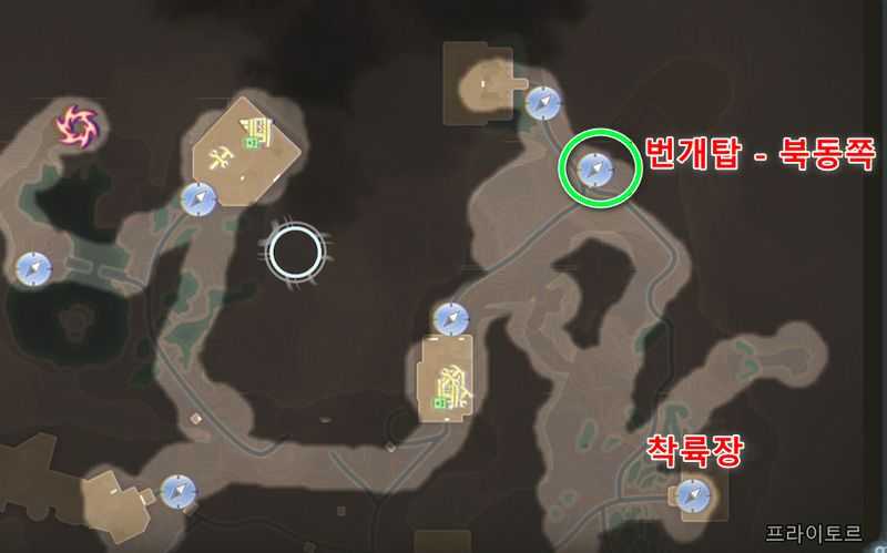 프라이토르 북동쪽에 있는 ‘번개탑 – 북동쪽‘ 빠른이동 지점에서 약간 남서쪽으로 가서 위 이미지 위치로 갑니다.