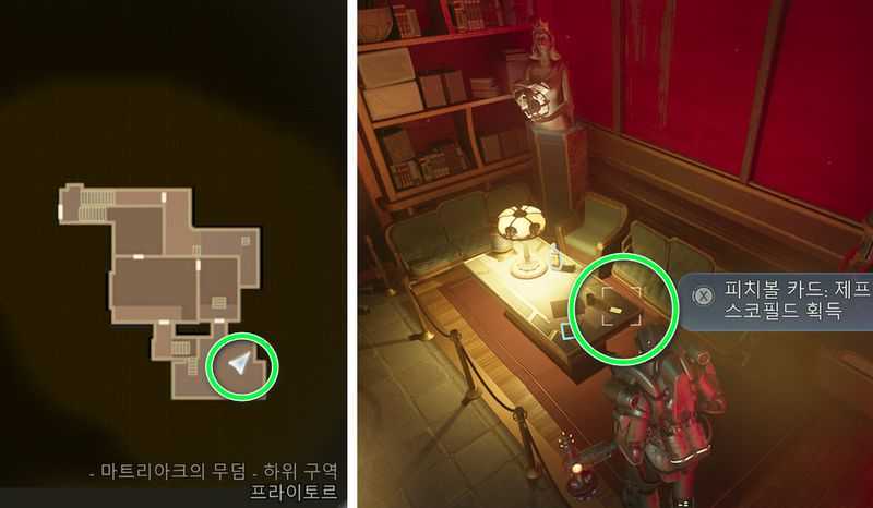 마트리아크의 무덤 – 하위 구역 남동쪽 끝으로 가면, 테이블 위에서 피치볼 카드: 제프 스코필드 (치명타 확률+1%) 획득