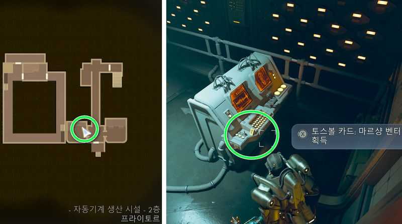 자동기계 생산 시설 2층 남쪽에 있는 위 이미지 위치로 간 후, 제어반 위에서 토스볼 카드: 마르샹 벤터 (치명타 확률+1%) 획득