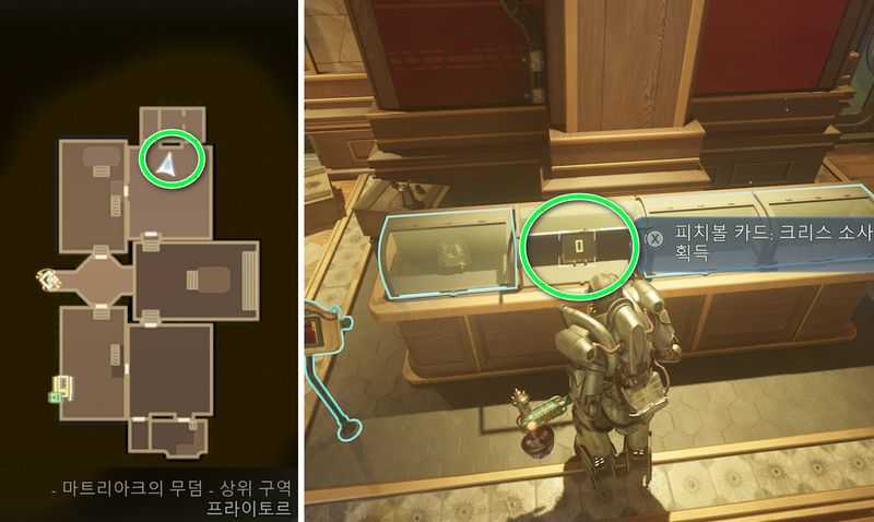 ‘마트리아크의 무덤’ 상위 구역 북동쪽으로 이동하여, 진열장의 2번째 덮개를 자물쇠 따기로 잠금해제하면 피치볼 카드: 크리스 소사 (최대 체력+5) 획득