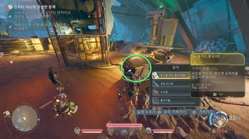 그러면 버려진 손전등이 깜빡깜빡 거리는게 보이는데 그 앞쪽 버려진 가방 위에서 토스볼 카드: 코리 몰로혼 (대미지+1%) 획득