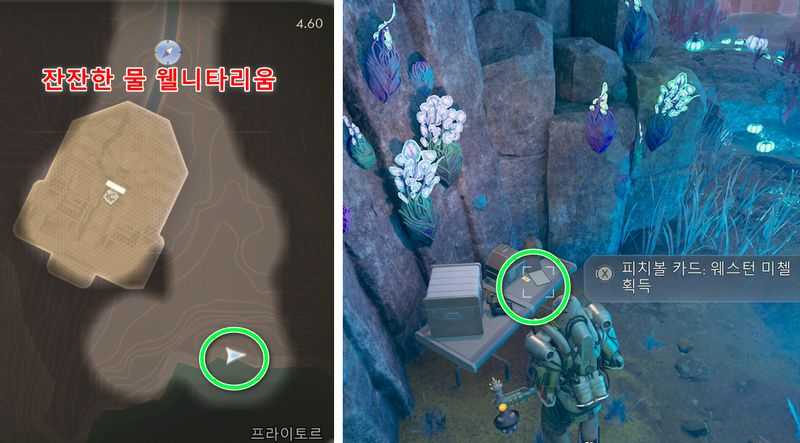 ‘잔잔한 물 웰니타리움’에서 남동쪽 해변으로 가면 ‘보호령 과학자’ x2가 있는 곳 옆의 테이블 위에서 피치볼 카드: 웨스턴 미첼 (도구 에너지 미터 최대+1) 획득