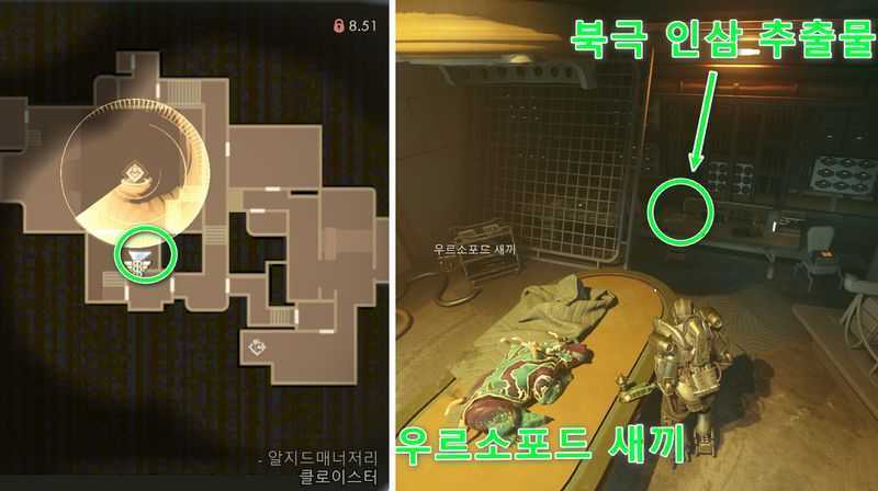 알지드매너저리 남서쪽 방으로 가면 ‘우르소포드 새끼‘가 있는데, 그 뒤의 테이블 위에서 ‘북극 인삼 추출물‘을 획득합니다.