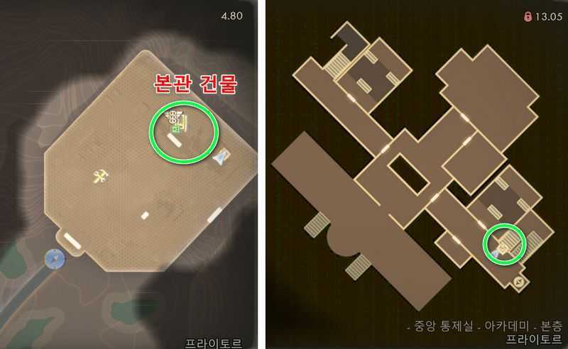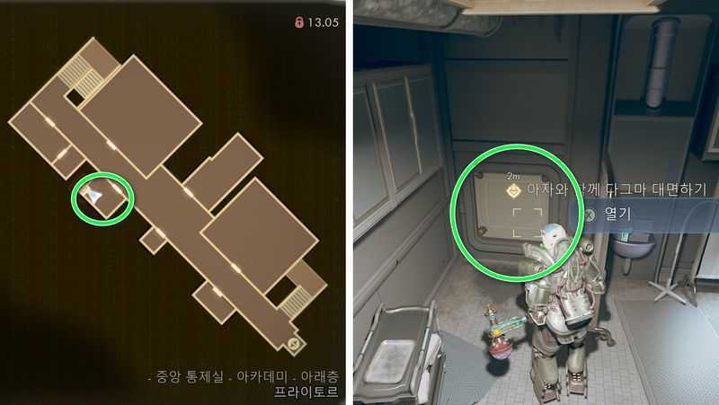 중앙 통제실 북동쪽에 있는 본관 건물로 들어간 후, 남동쪽에 있는 계단을 내려가, 아래층으로 갑니다.
