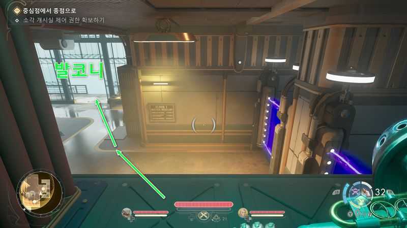 환풍구를 나오면 파란색 에너지 장벽이 보이는데, 좌측 안쪽의 발코니로 나갑니다.