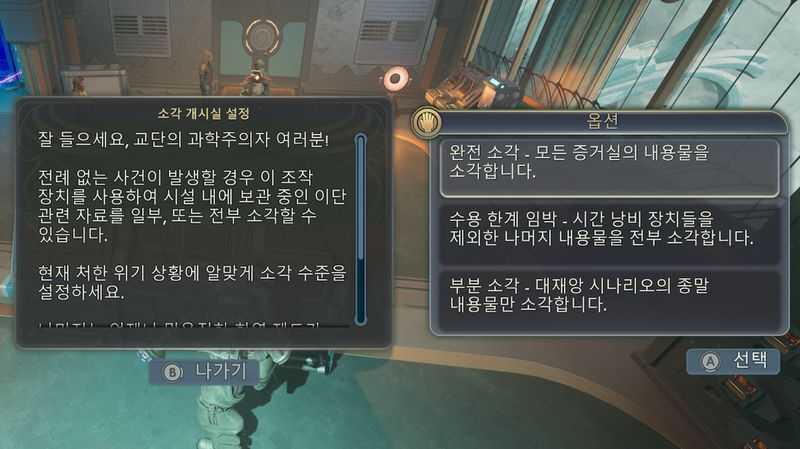 그후 방안의 단말기와 상호작용하여 [비상 프로토콜 비활성화]를 선택후 모든 연구 메시지들을 읽습니다.