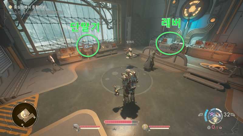 그러면 바닥에 전류가 흐르는 장소에 도착하는데, 좌측 안쪽의 단말기가 있으므로 상호작용합니다.