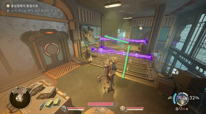 단말기 좌측의 계단을 올라가 2층까지 올라가면 ‘보조 실습생 스푼하워‘가 말하는 소리가 들리고, 우측에는 움직이는 보라색 레이저가 보일 것입니다.