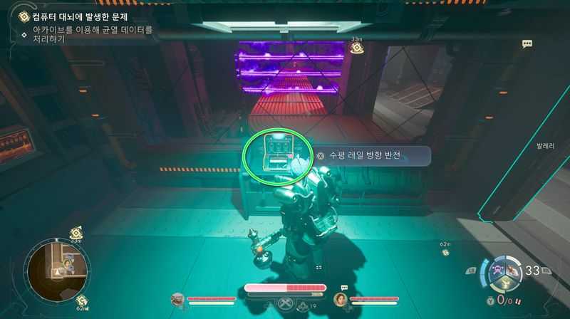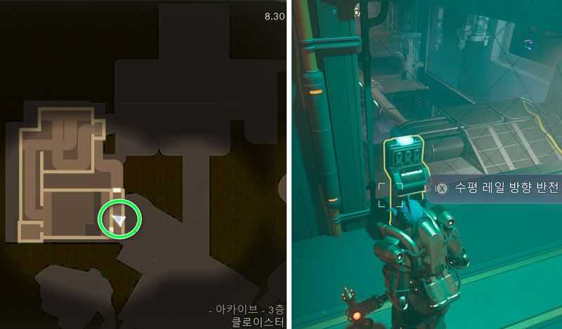 그러면 보라색 레이저가 보이는데, 좌측 방으로 들어가 레버를 당겨 [수평 레일 방향 반전]을 합니다.