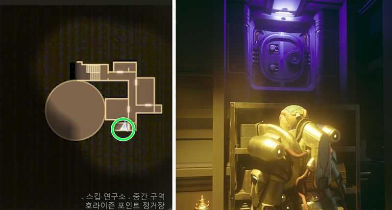 계단을 올라가, 목적지에 있는 격납고 단말기와 상호작용하여 [격납고 문 봉인 해제]를 선택합니다.